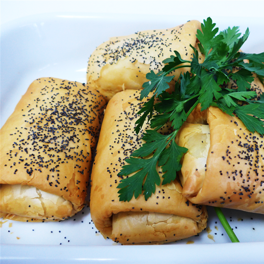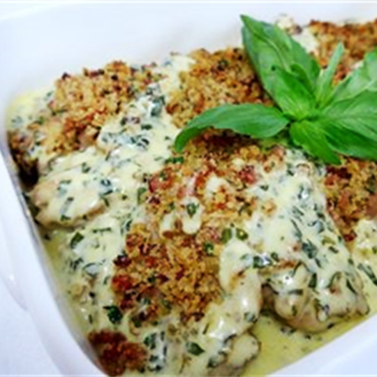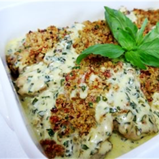 Chicken Parmesan Fillets with Creamy Basil Sauce (gf) served hot with choice of 2 salads (min 10)